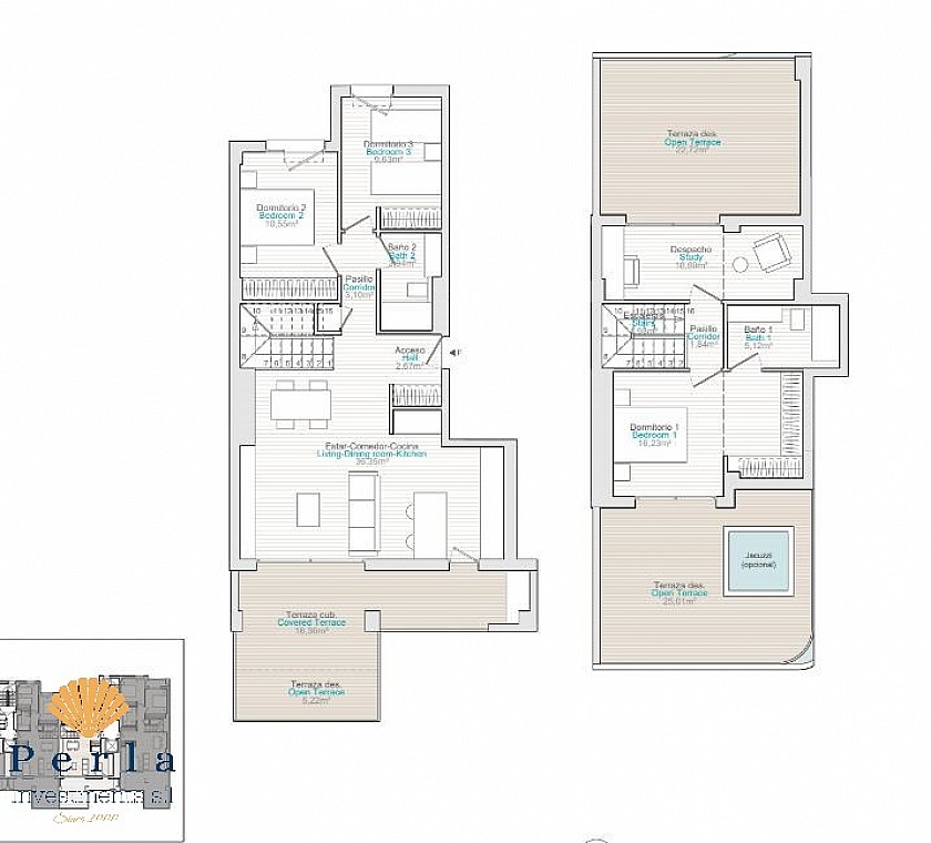 A beautiful 102,05penthouse 100 meters from the beach in an awesome commuity with 3 spacious bedrooms, 2 bathrooms with underfloor heating, a beautiful living room with a fully fitted kitchen with quality appliances, a bright living room that opens onto a 21,58m2 terrace and a 47,73m2 large solarium