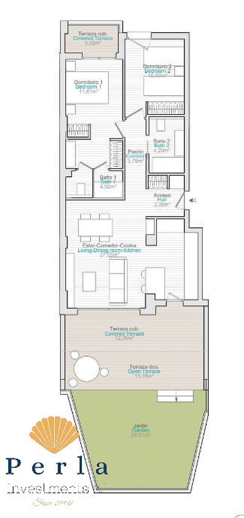Falleg 65,66m2 íbúð á jarðhæð 100 metrum frá ströndinni í æðislegum íbúðarkjarna með 2 rúmgóðum svefnherbergjum, 2 baðherbergjum með hita í gólfi, fallegt alrými með full innréttuðu eldhúsi með gæða heimilstækjum, bjartri stofu sem labbað er út á 27,35m2 svalir og 24,91m2 stórum garði.