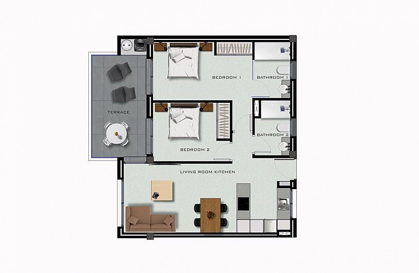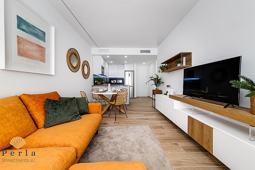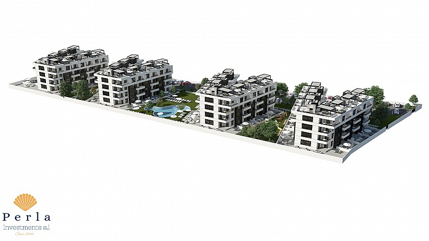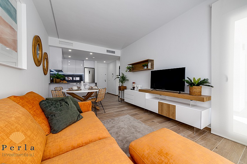 Þessari glæsilegu 2 svefnherbergja, 2 baðherbergja og 72,95m2 íbúð, fylgir jafnframt rúmgóð verönd.  Hún er staðsett í einstöku hverfi, og í aflokaðri íbúðarþyrpingu þar sem hugað er að hverju smáatriði, með sameiginlegu sundlauga og garðsvæði.  Í sama íbúðarkjarna eru í boði glæsilegar íbúðir með garði og íbúðir með þaksvölum og glæsilegu útsýni.